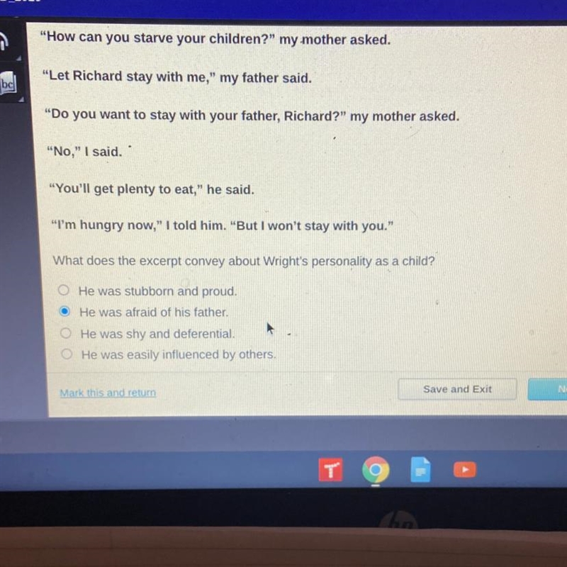 What does the excerpt convey about Wright's personality as a child? He was stubborn and proud. He was afraid of his father. He was shy and deferential. He was easily influe…