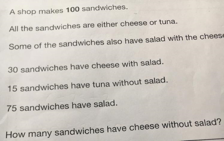 Since 75 sandwiches have salad this means that 75 - 30 = 45 of them have tuna with salad. Therefore, the amount of sandwiches that have cheese without salad is 100 - (30 + 15 + 45) = 100 - 90 = 10.