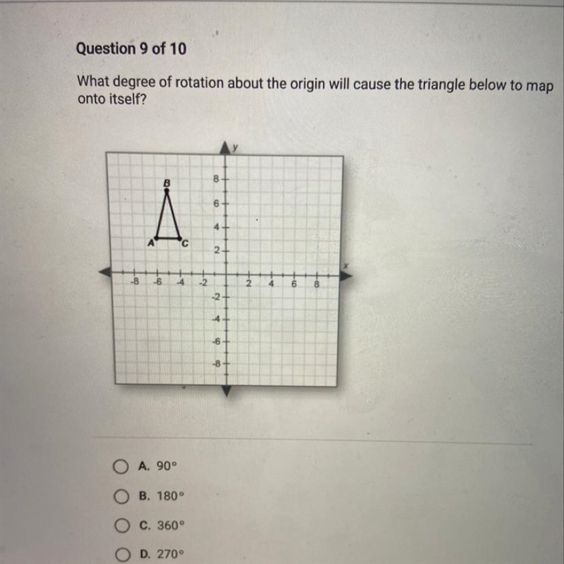 What degree of rotation about the origin will cause the triangle below to map onto itself?