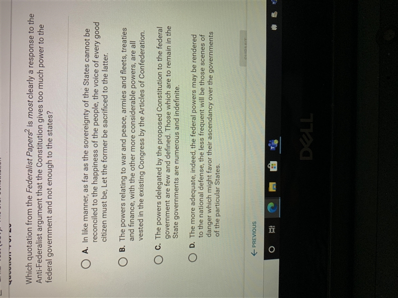 answer: c. the powers delegated by the proposed constitution to the federal government are few and defined. those which are to remain in the state governments are numerous and indefinite.