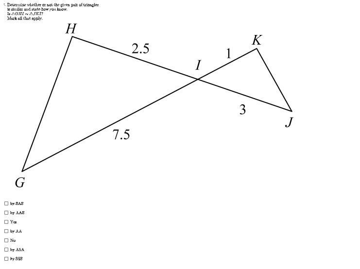 Determine whether or not the given pair of triangles is similar and state how you know. Is ΔGHI ~ ΔJKI? Mark all that apply.