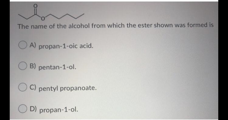 Propanoic acid + pentan-1-ol —> pentylpropanoate + water.