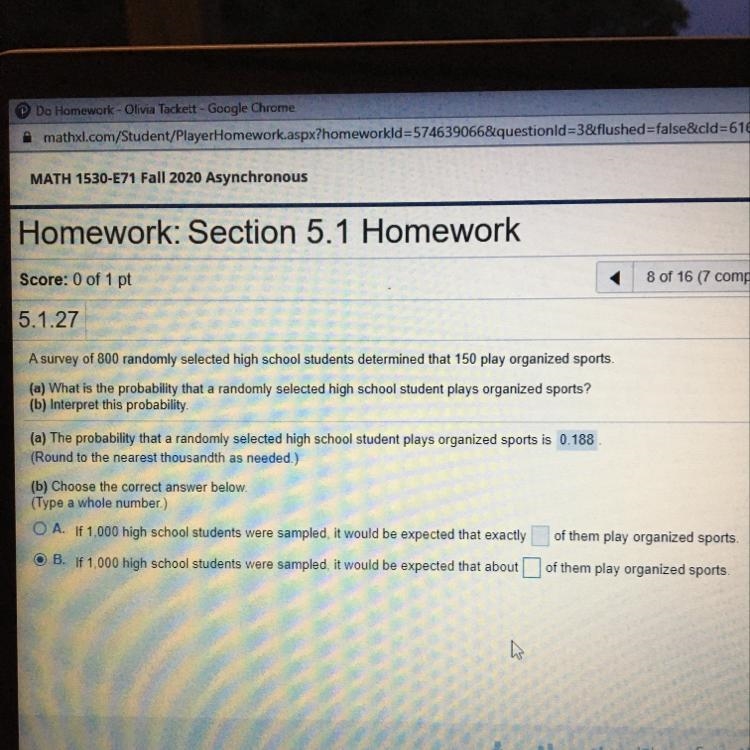 If the probability that a random high school student plays a sport is 0.188 (150/800), which means for every 1 high school student 0.188 of them play a sport. Multiply 0.188x1,000 to get 188 students who play a sport.