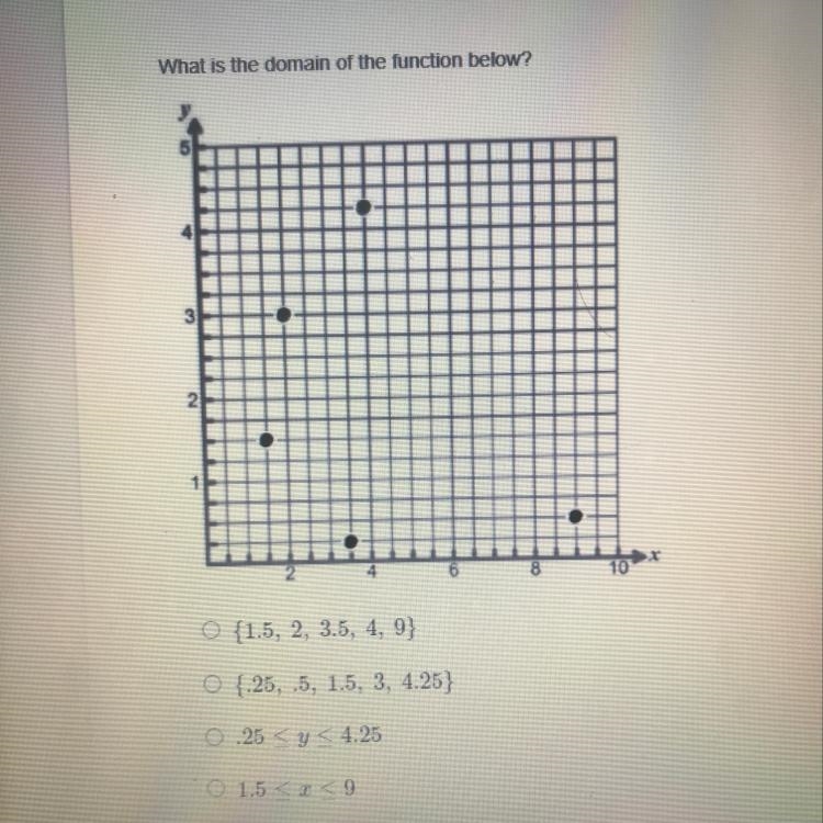 What is the domain of the function below? A.{1.5,2,3.5,4,9} B.{.25,.5,1.5,3,4.25}