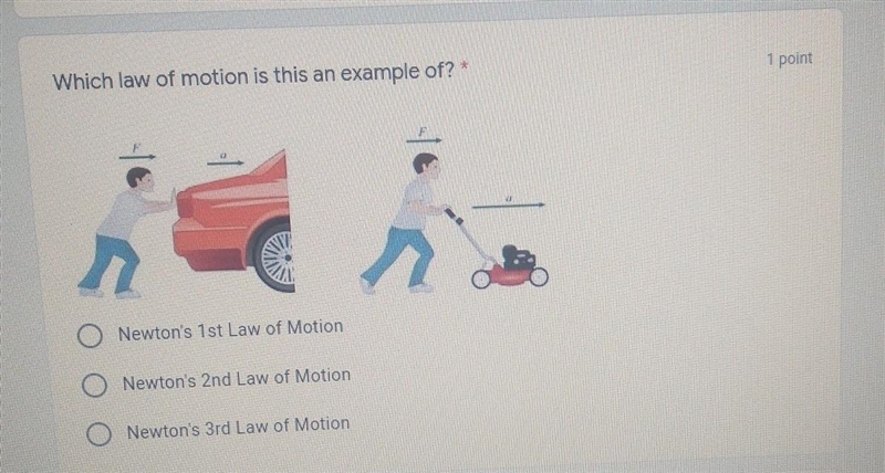 Which law of motion is this an example of? Newton's 1st Law of Motion Newton's 2nd Law of Motion Newton's 3rd Law of Motion