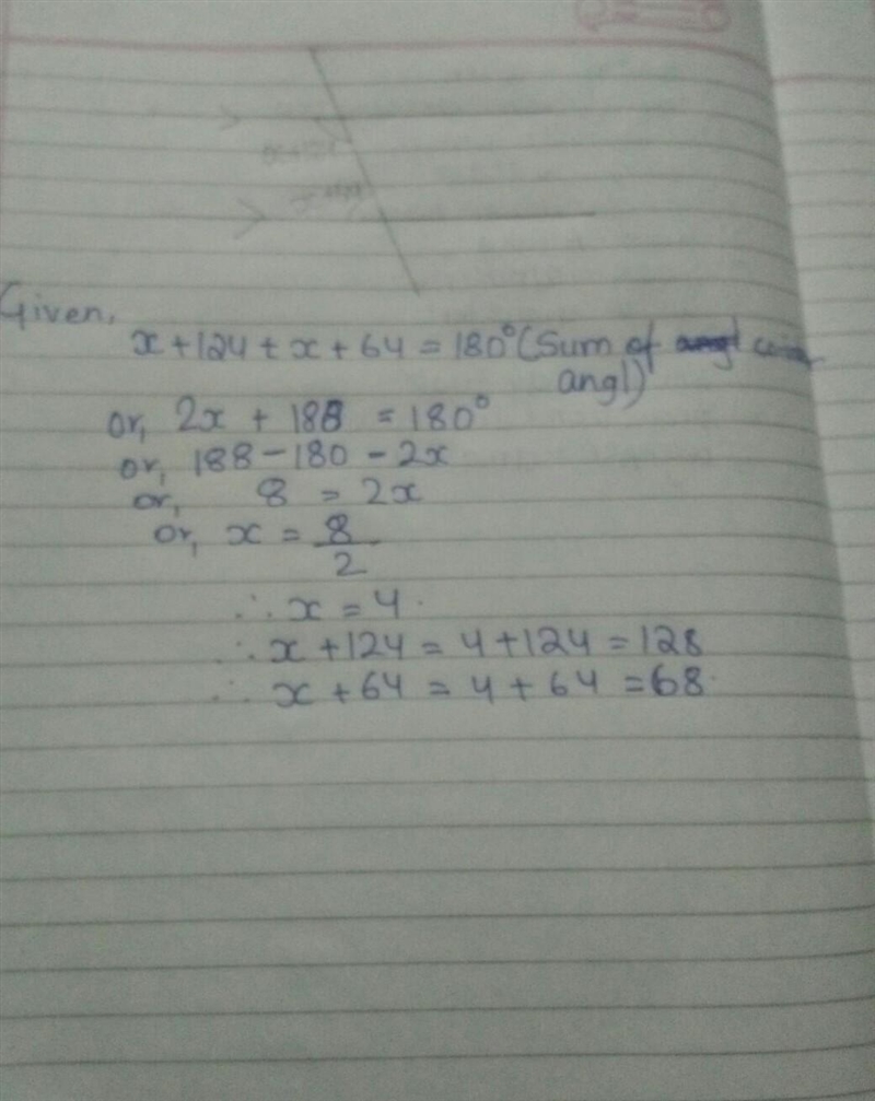 x+124° + x+64° = 180° [Co-interior angles sum is 180°]