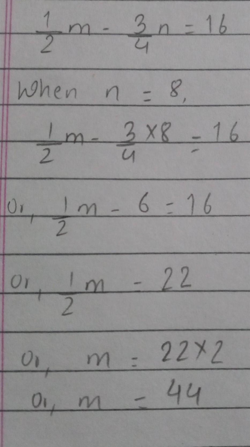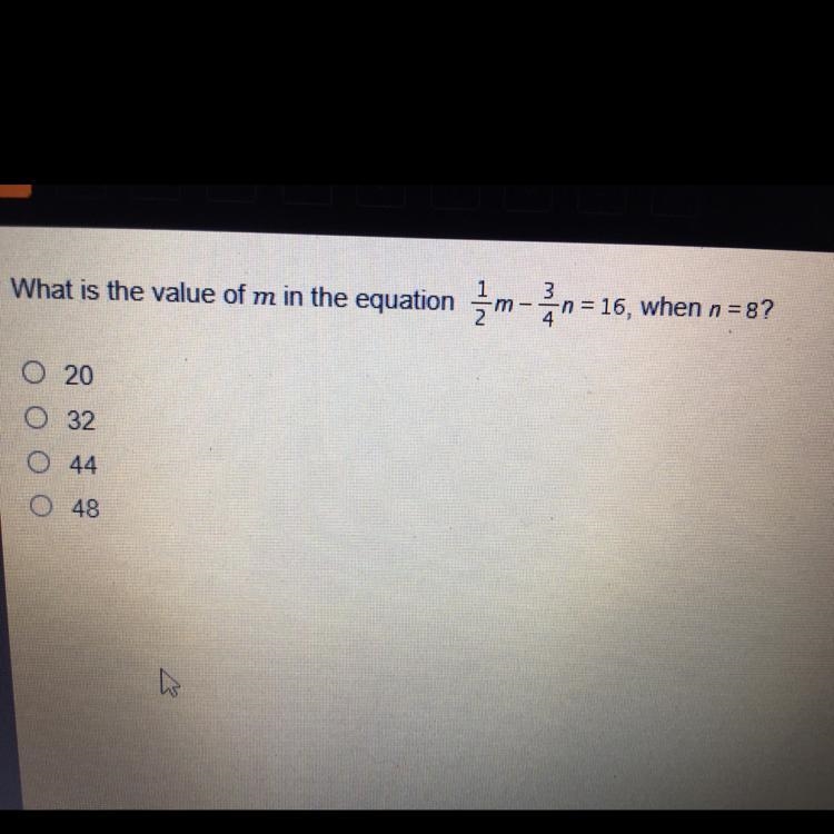 3 What is the value of m in the equation 3 -m- n = 16, when n=8? 4 20 32 o 44 O 48