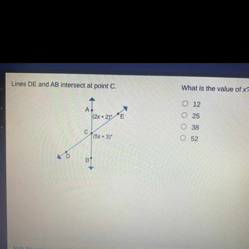 Lines DE and AB intersect at point C. What is the value of x? 12 25 38 С 5x-3)* 52
