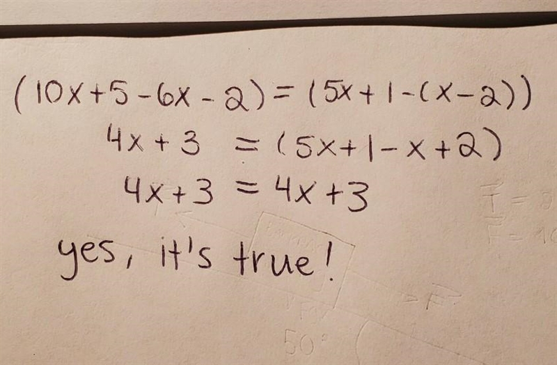 4. Is the expression (10x + 5 - 6x - 2) equivalent to (5x + 1 - (x - 2))? [True or False] Prove this using algebra - Show work].