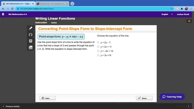Because b=3−(2)⋅(−4)=11 so y=2x+11