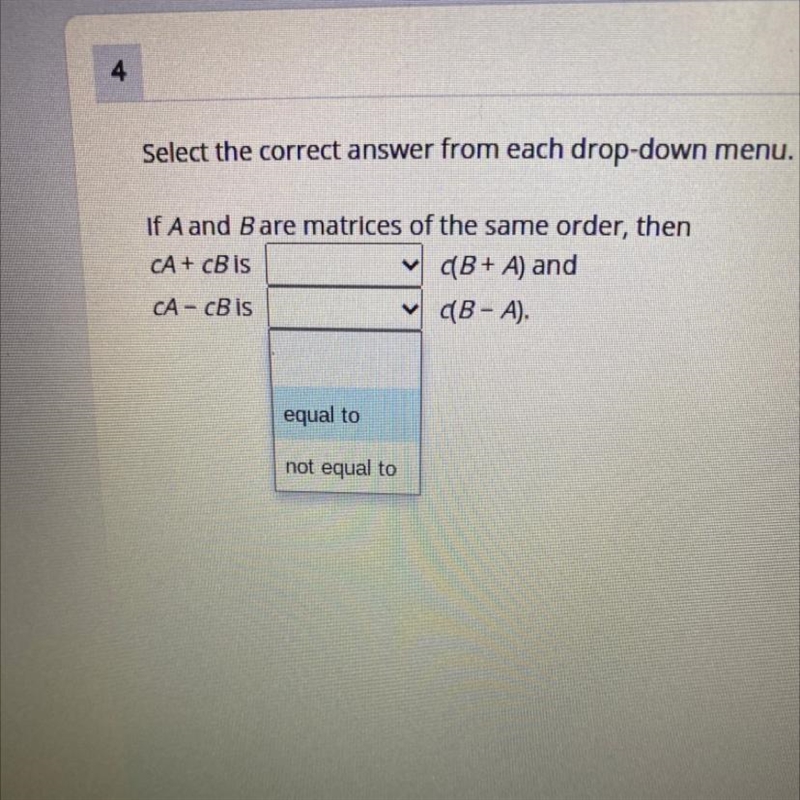 Select the correct answer from each drop-down menu. Options are (equal to, not equal to)