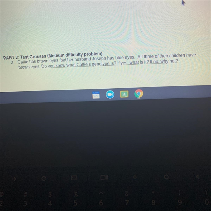 Since Callie has brown eyes, and all her children have brown eyes, we can only assume that the phenotype of brown eyes is dominand and Callie will have a dominant genotype, leaving Joseph to have a reccesive genotype (if Joseph was heterozygous for this aspect, he would have brown eyes) and the children will be heterozygous, with brown eyes as this characteristic predominates over blue eyes.