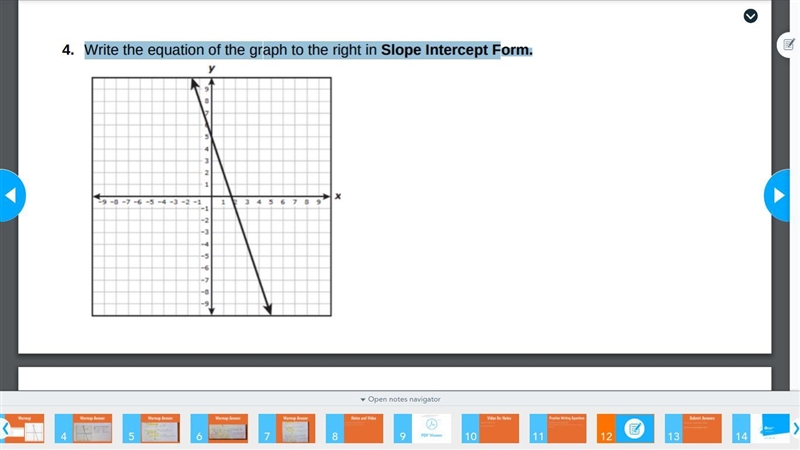 find your slipe and intercept using y=mx + b. mx, being slooe you'd use rise over run. And the b is your y-intercept, being 5.