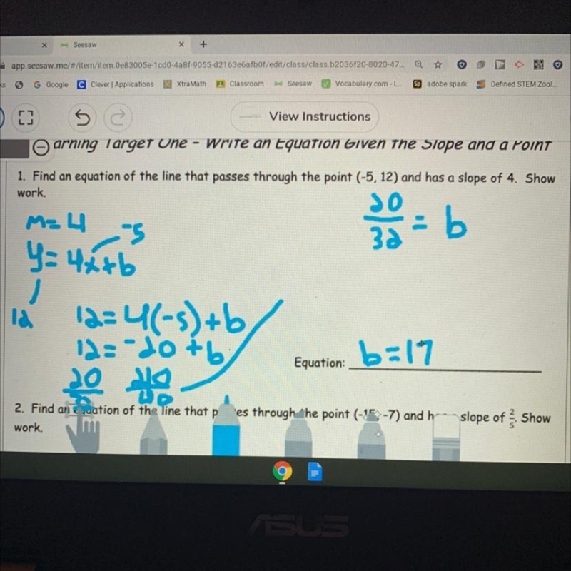 The line of the equation that has a slope of 4, and passes through (-5, 12) is