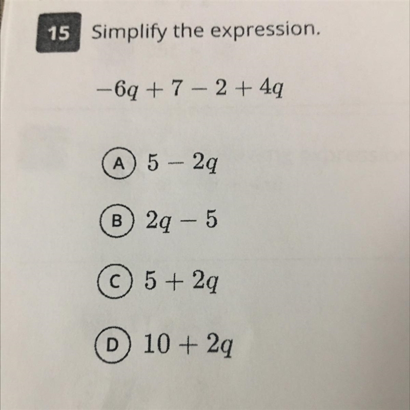 Which expression is equivalent to -4(7q + 4) + 6q? a. 7(4q - 4) + 6q b. 4(-4q + 7) + 6q c. -4(4 + 7q) + 6q d. -4(4q + 7) + 6q
