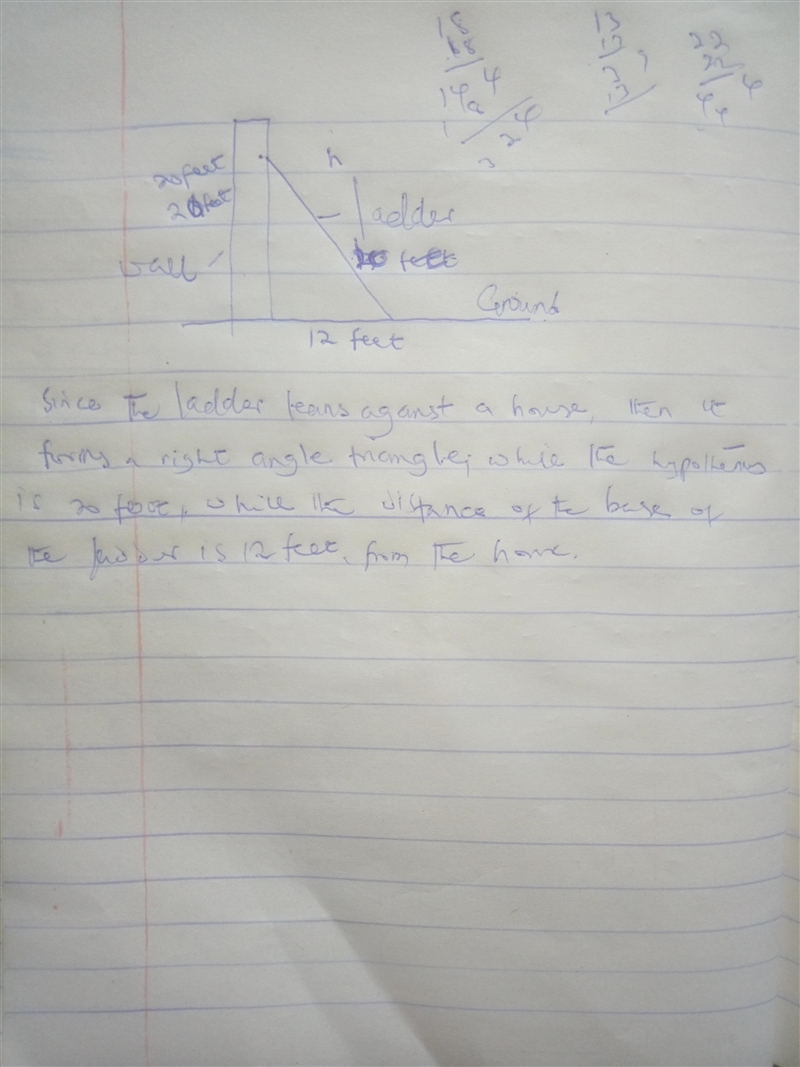 Since the ladder leans against a house, then it forms a right angled triangle while the hypothenus is 20 foot, the distance of the base of the ladder is 12 feet from the house, hence we are required to find the point at which the ladder touches the house I.e height, rep by h.