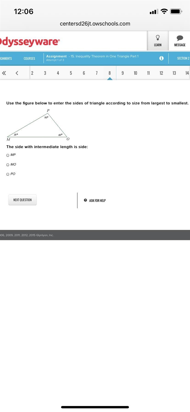 Use the figure below to enter the sides of triangle according to size from largest to smallest. The longest side is side PO MO MP