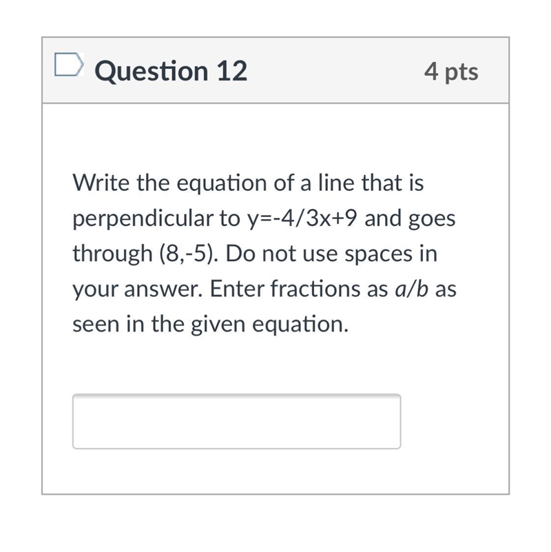 When a line is perpendicular to another line, their slope is the opposite reciprocal of that. So in this case, the slope of the perpendicular line would be positive 3/4. Next, plug in the points (8,-5) in the y=mx+b formula along with the new slope. In conclusion, the new point slope formula is y=3/4x-11.