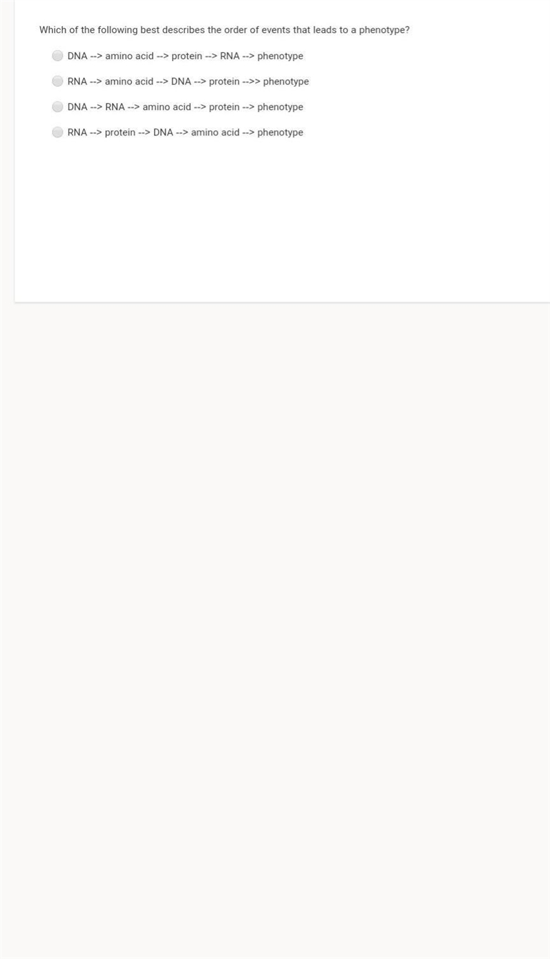 The correct answer is - DNA --> RNA --> amino acid --> protein --> phenotype.