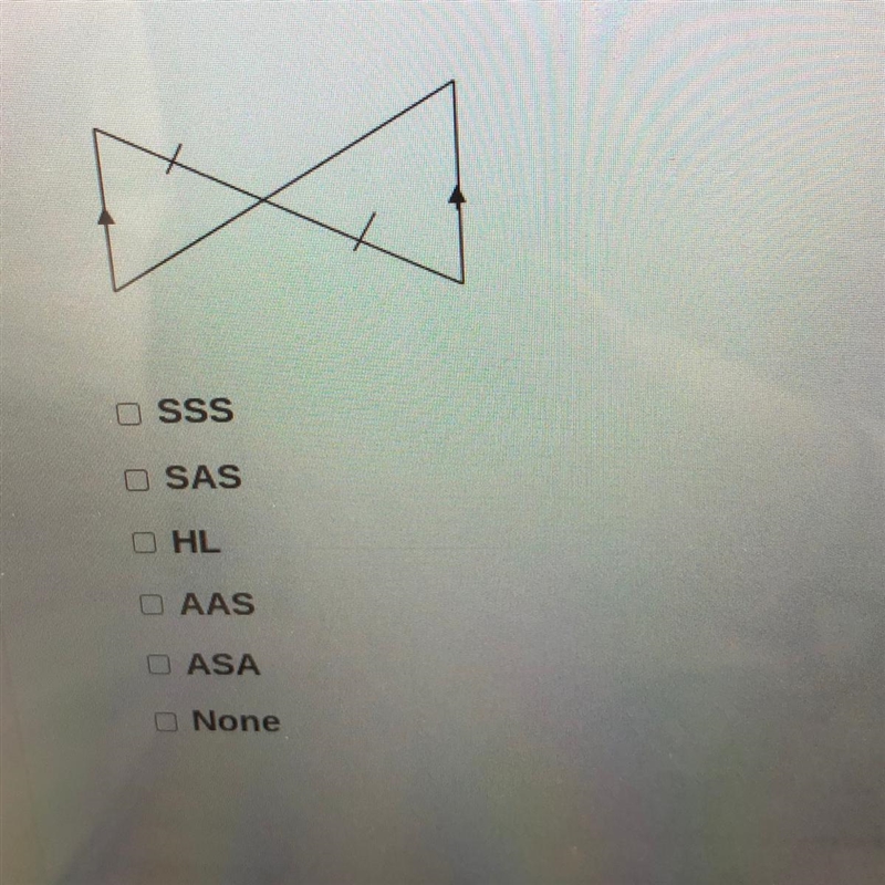 Name the triangle shortcut in the picture. O SSS OSAS O ASA O AAS OHL O cannot be determined