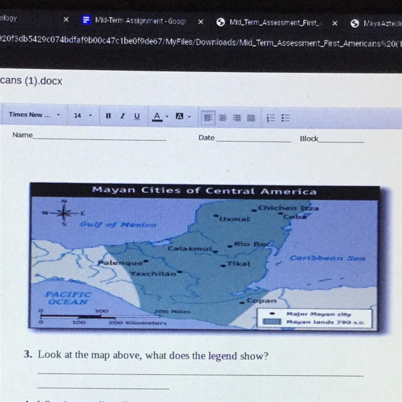The legend shows the major Mayan cities with black dots and it also shows the Mayan lands from 790 A.D. by a shaded area.
