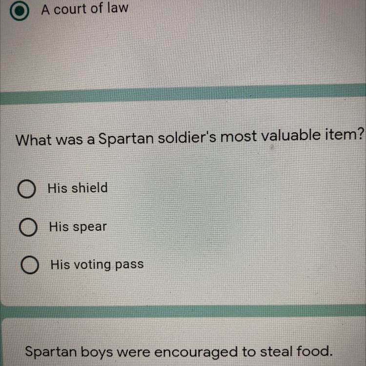 The spartan's soldier's most valuable item is his shield. Hope this answered your question!