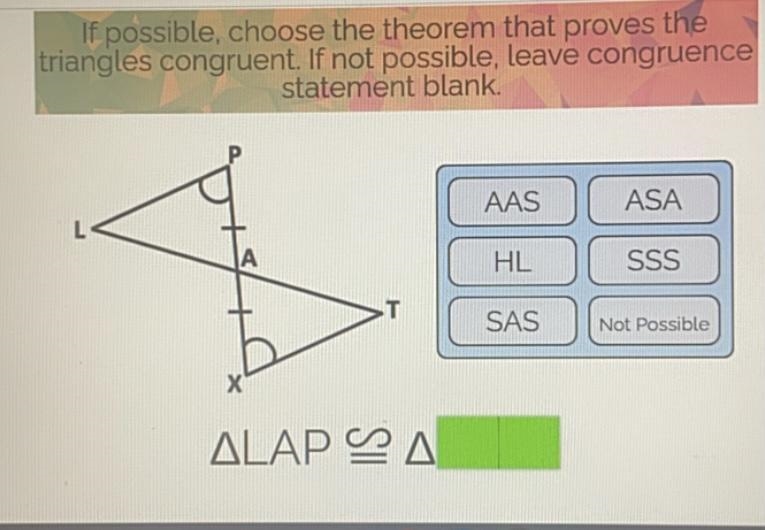 Angle P and x are congruent, side AX and AP are congruent, and angle LAP and angle TAX are congruent because vertical angles are congruent.