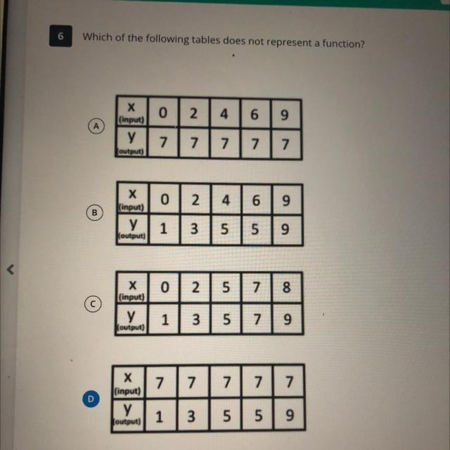 It's not A because 7 is being repeated for y more than once. It's not B because 5 has been repeated more than once for y. It's not D because 7 is being repeated more than once for x. If you look at C, you can see that no numbers are being repeated for x, and no numbers are being repeated for y.
