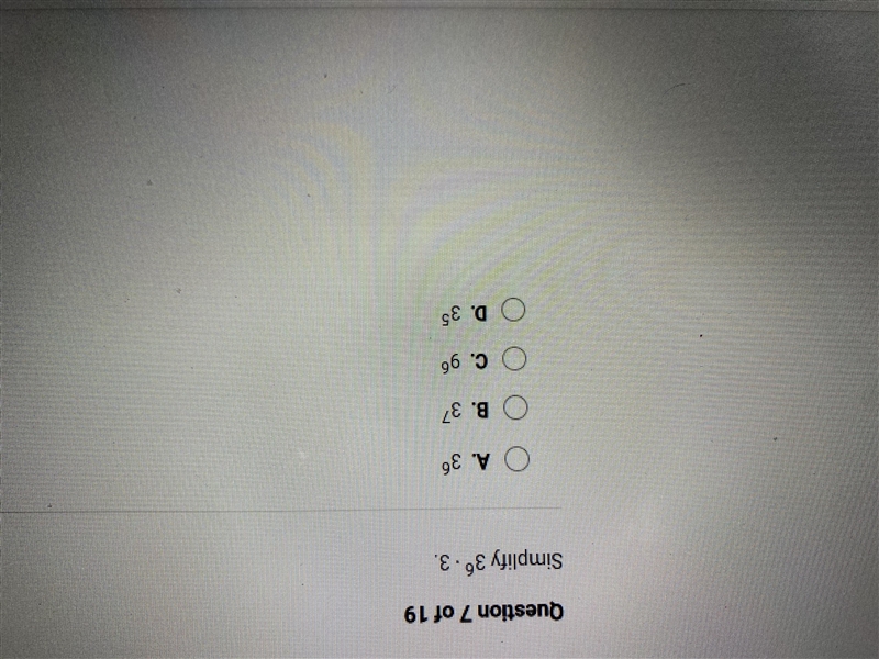 3^7 because 3^6*3 is the same as 3*3*3*3*3*3*3 which is 7 threes so it’ll be 3^7 or letter choice B