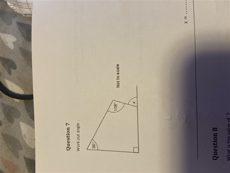 fourth = 360° - ( 30 + 108 + 90)° = 360° - 228° = 132°